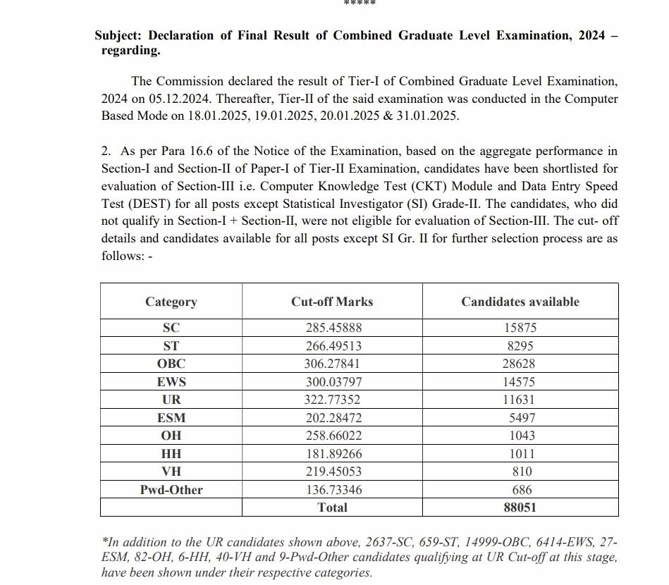 कर्मचारी चयन आयोग द्वारा COMBINED ग्रेजुएट लेवल(CGL) परीक्षा का आयोजन तीन चरणों(टियर 1,टियर 2 और टाइपिंग) में होता है| आयोग ने SSC CGL टियर 1 परीक्षा का आयोजन 9 सितम्बर से 26 सितम्बर तक कंप्यूटर आधारित प्रारूप में हुआ था|जिसका रिजल्ट 5 दिसम्बर 2024 को जारी किया गया|एसएससी सीजीएल टियर 1 में उत्तीर्ण उम्मीदवार टियर 2 परीक्षा के लिए क्वालीफाई हुए|SSC CGLटियर 2 परीक्षा 18,19,20 जनवरी 2025 को आयोजित की गई|CGL टियर 2 टाइपिंग परीक्षा का आयोजन 31 जनवरी 2025 को हुआ|जिसका अंतिम परिणाम 12 मार्च को जारी किया गया|